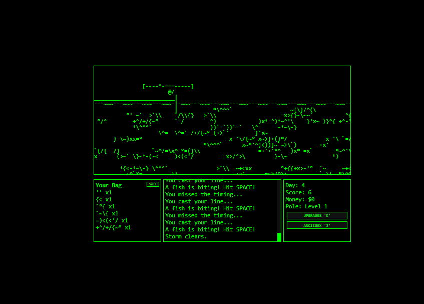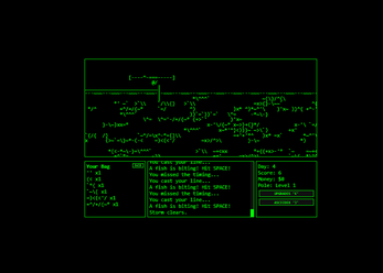 Time your catch in the ASCII reel-bar minigame
